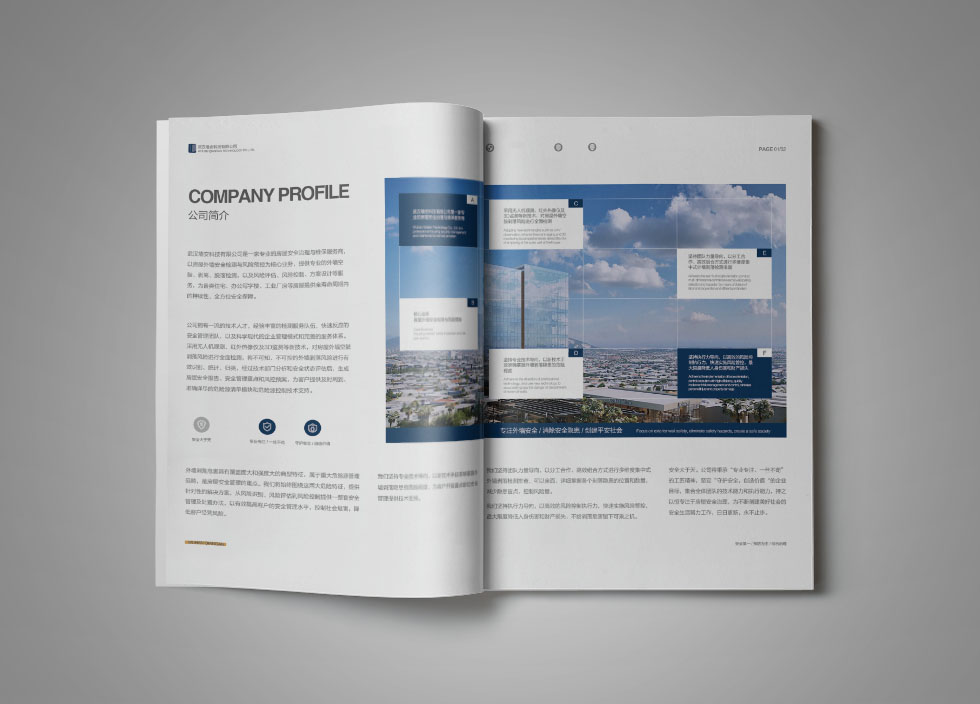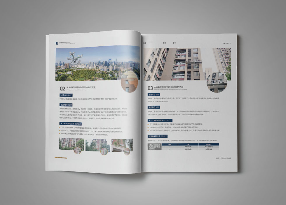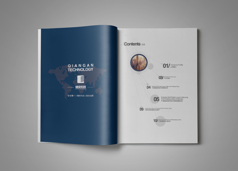 項目背景:武漢墻安科技有限公司是一家專業的房屋安全治理與維保服務商,以房屋外墻安全檢測與風險預控為核心業務,提供專業的外墻空鼓、剝離、脫落檢測,以及風險評估、風險控制、方案設計等服務,為各類住宅、辦公寫字樓、工業廠房等房屋提供全壽命周期內的持續性、全方位安全保障。艾的爾承接其畫冊設計制作,成立品牌設計小組,與企業進行深入溝通,明確企業對于畫冊設計的需求,通過對企業行業屬性和主要服務的深入了解和研究,在畫冊設計、創意的過程中,封面大膽留白,將重點突出“房屋外墻剝落安全治理專家”。