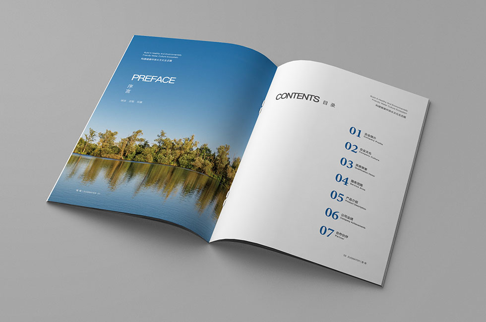 項目背景:楚格是以水處理工程設計與施工、水處理技術開發與設施運營、環保成套設備制造安裝為主體的高新技術企業,產品涉及膜技術產品、市政給水、市政污水、工藝給水、工業污水、工業循環水、生活污水與中水回用處理等水處理領域,可提供高效的項目咨詢與評價、工程設計與技術支持等全過程高品質的服務。艾的爾設計承接其企業宣傳冊設計及制作,成立品牌設計小組,與企業進行深入溝通,明確企業對于畫冊設計的需求,封面采用藍色為主,突顯