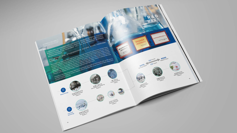 項目背景:武漢遠大弘元股份有限公司前身是原武漢大學校辦企業——武漢大學生物工程技術公司,2000年進行了股份制改造,2008年遠大醫藥(中國)有限公司通過收購重組與武漢大學等單位達成戰略合作。公司以氨基酸及其衍生物的研發、生產為基礎,以武漢大學生命科學學院和湖北省氨基酸工程技術研究中心的成果為依托,致力于生物醫藥領域的高新技術產業化。艾的爾承接其畫冊設計制作,成立品牌設計小組,與企業進行深入溝通,明確企業對于畫冊設計的需求,通過對企業行業屬性和主要服務的深入了解和研究,在畫冊設計、創意的過程中,重點將“弘揚科技 健康之元”的主旨展示出來,畫冊主要介紹企業的氨基酸相關技術,主題為“創一流氨基酸企業,還原于社會”。封面大膽留白,使主題突出,清晰抓人眼球。風格設計簡約但不簡單,突出信息主題,版面設計中可以看出設計師在設計過程花了不少心思,例企業文化版塊中將DAN大圖利用黃金比例分割占中間排版,表明基因是DNA,氨基酸的合成受基因影響,猶如企業的發展歷程,一步一步形成了如今的遠大弘元。每個版面中的插圖、排版、都直入主題,點明中心。