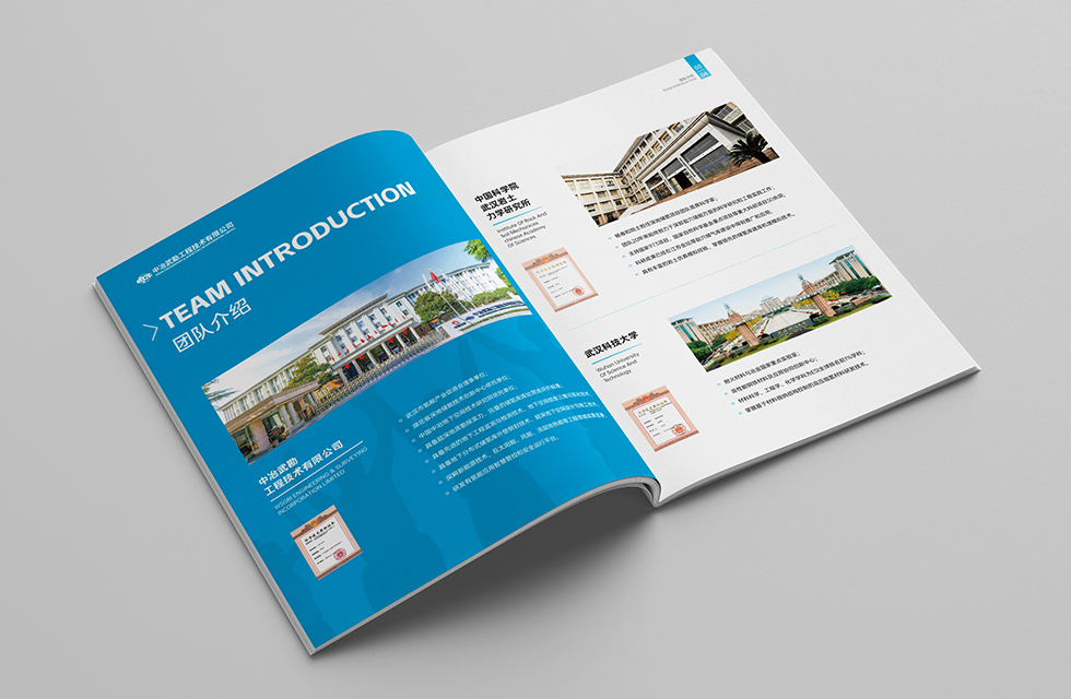 項目背景:中冶武勘堅持“冶金勘察國家隊,資源保障主力軍,基本建設排頭兵,巖土工程、智慧應用、資源勘查領域具有特色的工程綜合服務提供商”戰略定位,依托測繪、勘察、檢測監測、巖土工程等傳統主業核心基礎支撐,積極打造工程總承包、智慧應用、能源環保、資源開發四大業務板塊,構建傳統主業及資源勘查與礦山建設、智慧應用、地下空間開發、巖土工程一體化、新能源工程、生態環境治理、特色基礎設施建設八個業務方向,為客戶提供集規劃、投資、建設、運維為一體的工程全生命周期服務。艾的爾設計接受其委托,承接畫冊設計項目。在畫冊設計、創意的過程中,設計師通過對行業屬性進行深入地了解,根據企業屬性,進行了畫冊設計、創意。在畫冊封面設計中,選用具有深地儲氫系統代表性且現代感、企業化的圖片組合成‘H’和‘M’,‘H’代表氫能源,則右側設計感的‘M’代表MCC,對字母組合進行藝術化設計,使得整個封面具有嚴謹、穩重的風格,大膽留白凸顯字母‘H’和‘M’,展現了企業的經營業務和追求科技以及嚴謹負責的工作態度。封面字體設計干凈利落,藍色代表理性科技,契合企業形象。在內頁的設計中,按黃金分割比例設計,標題與文字的板塊相互呼應文圖分布疏密有致,整個版面簡潔優雅。畫冊內頁的顏色選用上,和封面相互呼應,以藍白等清新雅致的顏色為主。整個畫冊,設計精簡、嚴格,充分展現出了企業的訴求和形象。