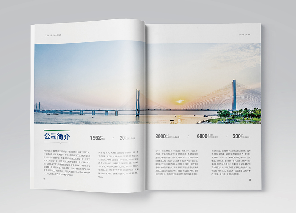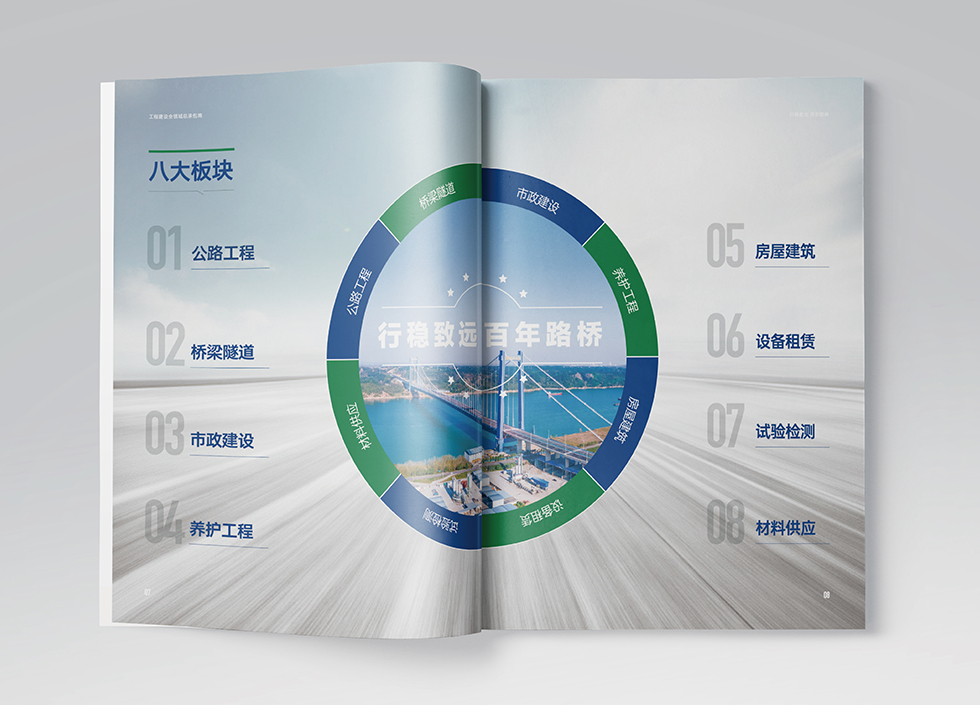 項目背景:湖北路橋是一家建筑施工總承包一級控股公有公路工程施工總承包特級、市政公用工程施工總承包一級、橋梁、隧道工程專業承包一級資質的公司,愿景是成為最具國際競爭力的綜合型建筑企業集團,艾的爾設計接受其委托,承接畫冊設計項目。在畫冊設計、創意的過程中,設計師通過對行業屬性進行深入地了解,根據企業屬性,進行了畫冊設計、創意?;诖?,封面采用公司具有意義的代表性工程的插畫形式,展現結構與專業性、行業屬性。整體采用品牌標準色藍色,穩重不失活力,內頁使用建筑工程概念圖占據大幅畫面,給讀者視覺上的享受與直觀的業績展現