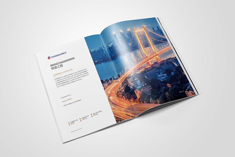項目背景:武漢天創市政建設工程有限公司是一家以城市道路工程、橋梁工程、地下通道工程、給排水工程、鋼結構工程、園林綠化工程、水利水電工程、機場跑道、隧道工程、房屋建筑工程、公路與公路養護工程等基礎設施建設為主業,年產值超過20億元的大型建筑業企業。艾的爾設計承接其畫冊設計,成立品牌設計小組,與企業進行深入溝通,明確企業對于畫冊設計的需求,畫冊封面已橋梁為封面圖,直點主題,清晰明了的看出是哪個企業做的,內頁已藍白色為主,藍色代表企業風,大氣簡約,它是一種理智色彩,清晰明化的知道自己想要什么;白色凸顯健康、明亮、爽朗。