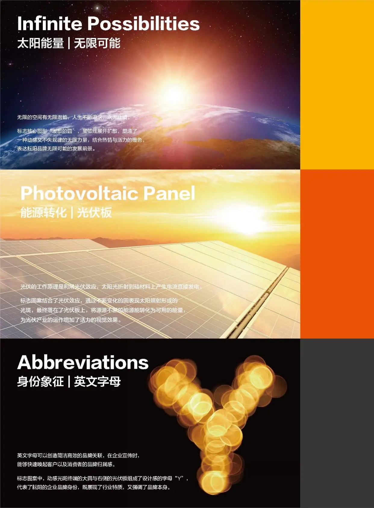 標志圖案中,動感光斑終端的大圓與右側的光伏板組成了設計感的字母“Y”,代表了耘陽的企業品牌身份,既展現了行業特
