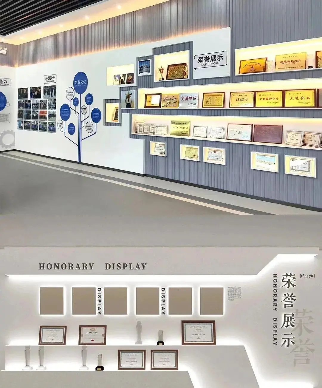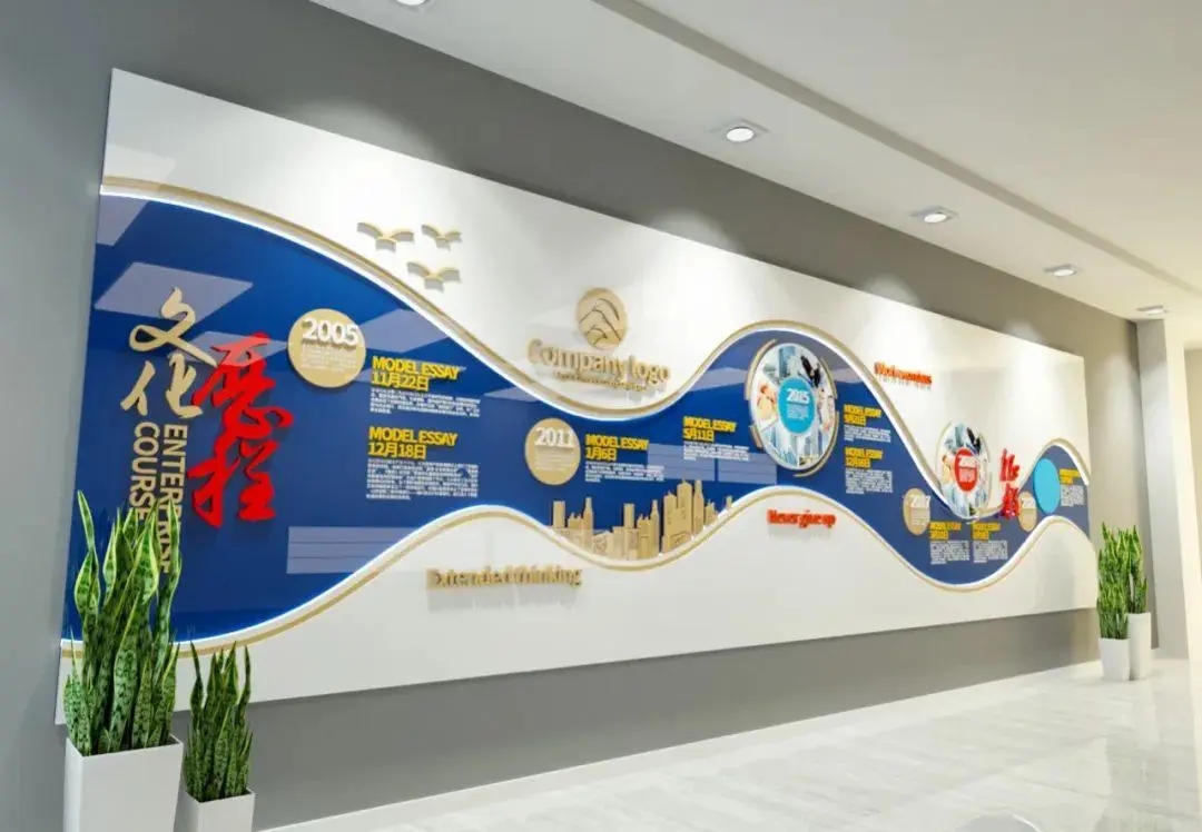 一般有大廳單面展示墻、走道墻面、樓梯墻面、各部門墻面、單獨展廳等。