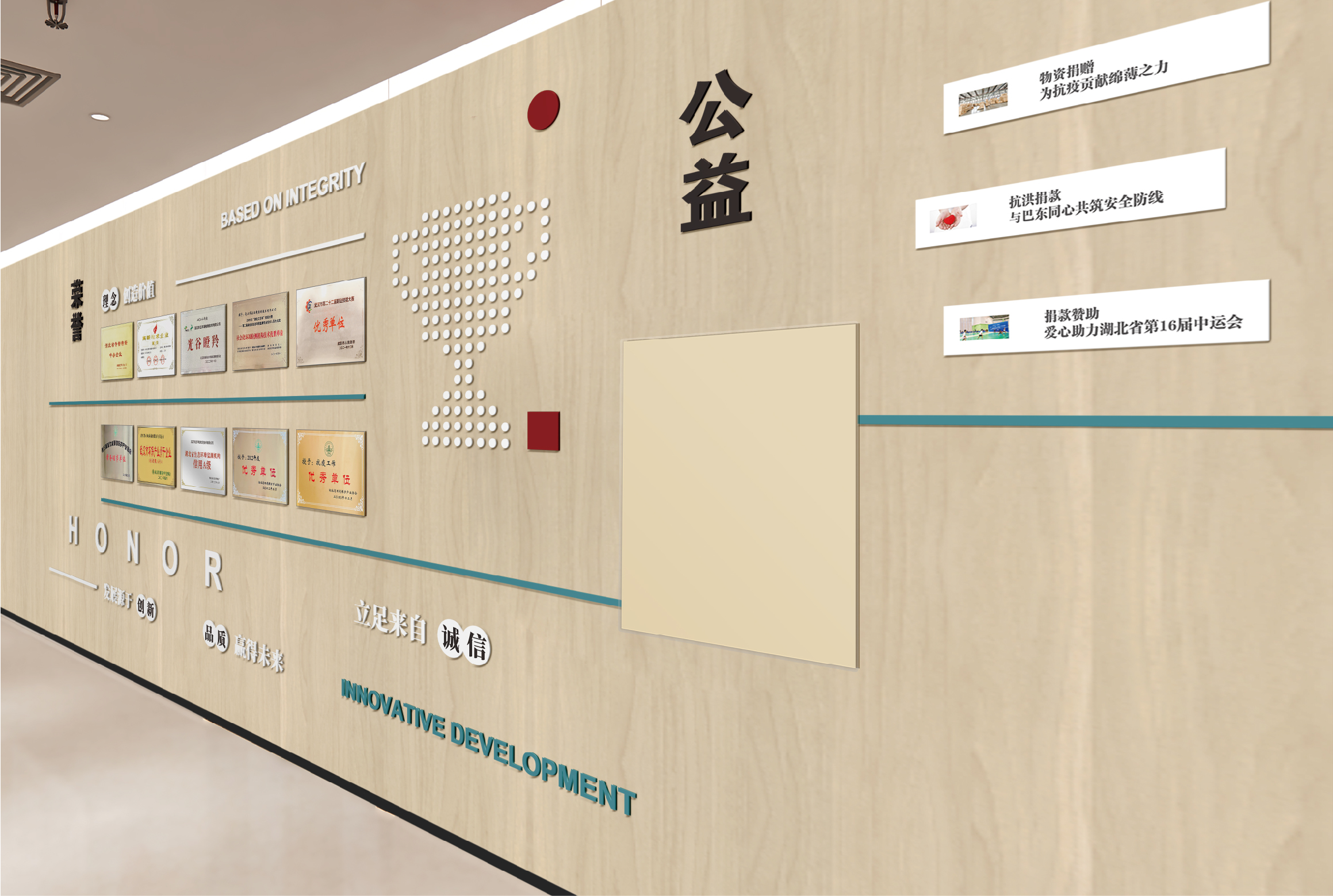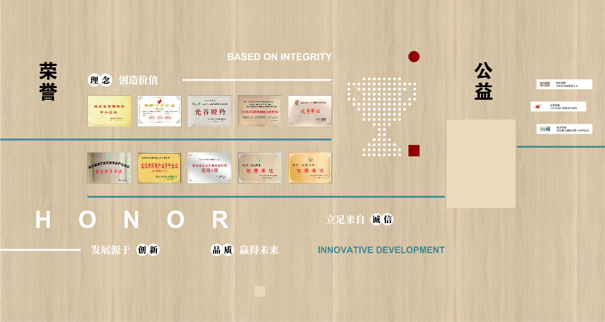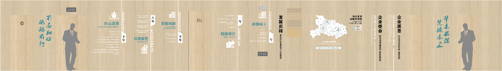 項目背景:華正環境是一家專業從事環境檢測并基于環境檢測開展環境咨詢服務的高新技術企業, 成立于2013年,總部位于武漢市東湖高新技術開發區。旗下設有武漢華正、江西慧正、寧夏華正、宜昌華正、襄陽華正等5個標準化實驗室以及華正環境研究院、湖北葦杭環??萍加邢薰镜葘I的環境咨詢服務機構。 經過近10年的發展,“華正環境”依托自有具有規?;牡谌江h境檢測平臺,構建特色鮮明、優勢互補的環境檢測和環境咨詢“雙輪驅動(T+C)”發展模式。全方位為政府、園區、企業提供 “一站式”第三方環境綜合服務,統籌解決各方面環境問題。服務范圍覆蓋華中及中西部地區多個省份,為近萬家客戶提供各類“環境檢測”和“環境咨詢” 綜合解決方案。艾的爾品牌設計承接其文化墻設計,與客戶深入溝通后,結合企業自身特點,從企業簡介,發展歷程,使命,愿景,榮譽,公益等出發,內容簡潔明了、主題突出。